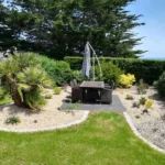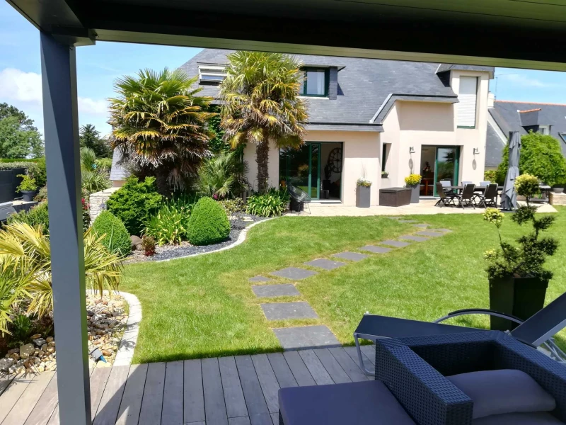 -Semi de gazon, plantations diverses (palmiers, plantes,…), paillages minéraux (ardoises, blocs de roches), intégration de clôture, intégration de pas japonais
