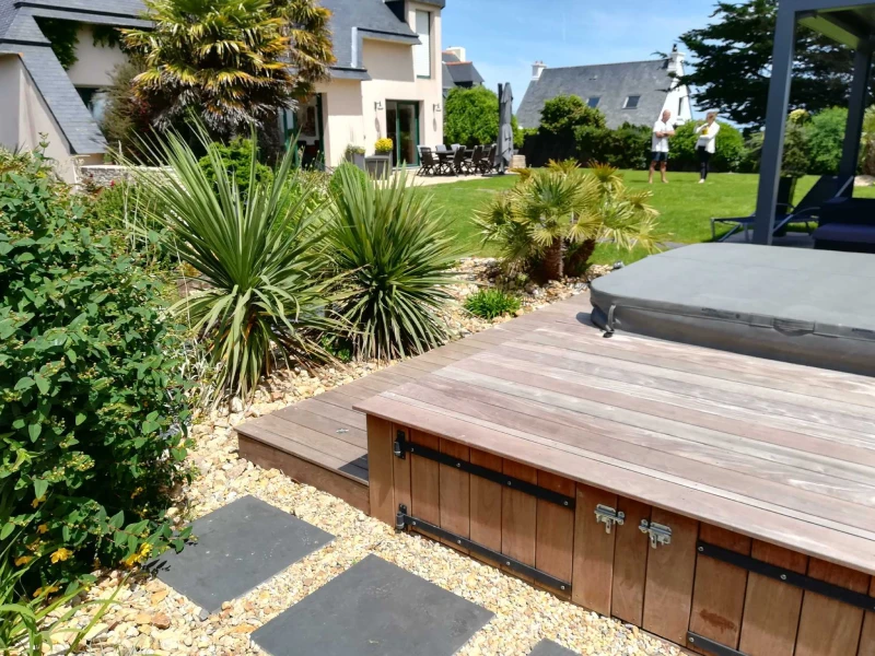 -Installation d’un espace détente avec aménagement de la terrasse en Ipé pour accueillir le jacuzzi