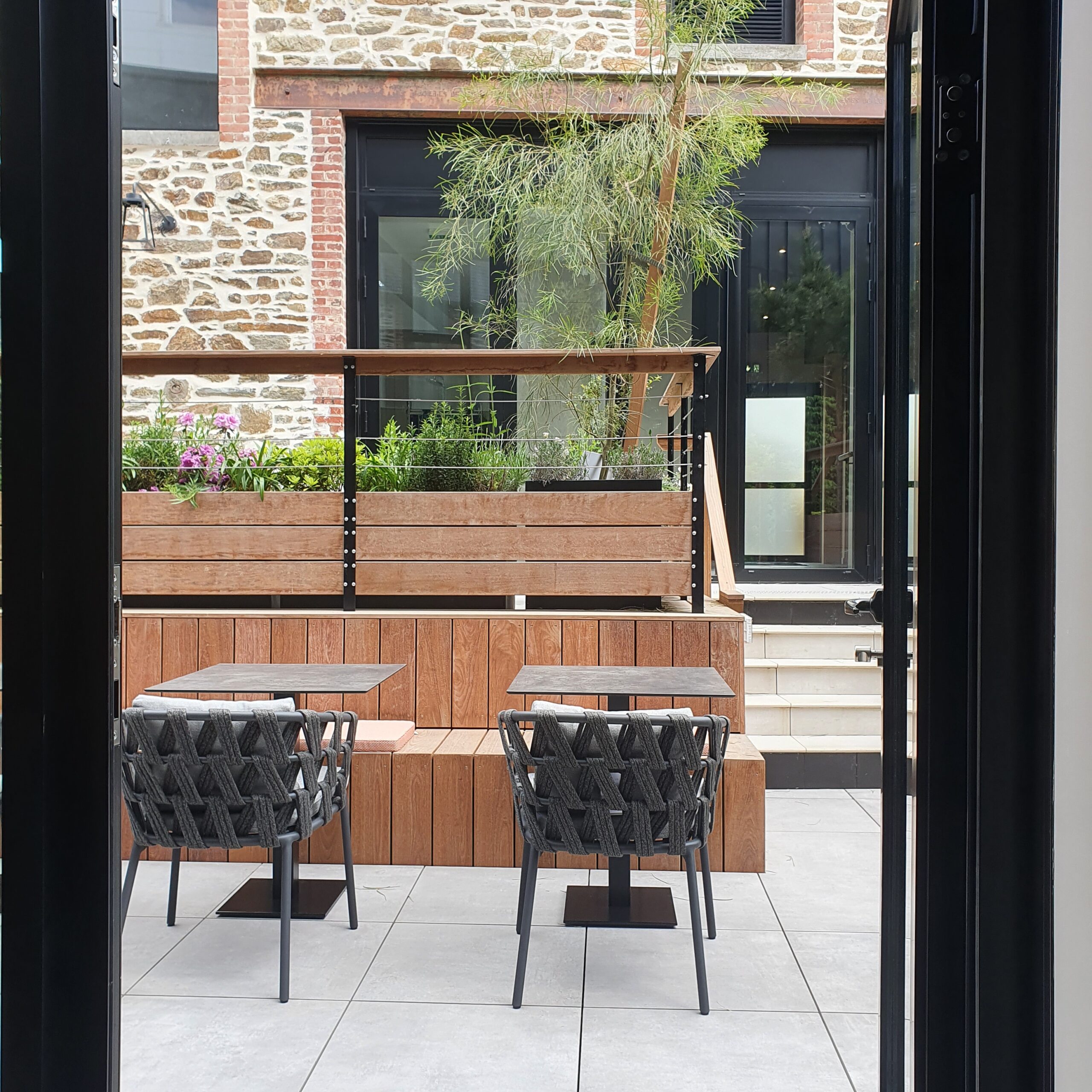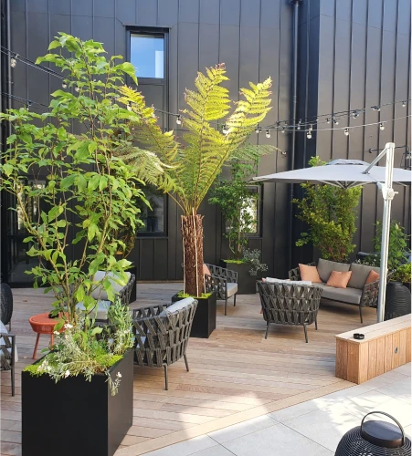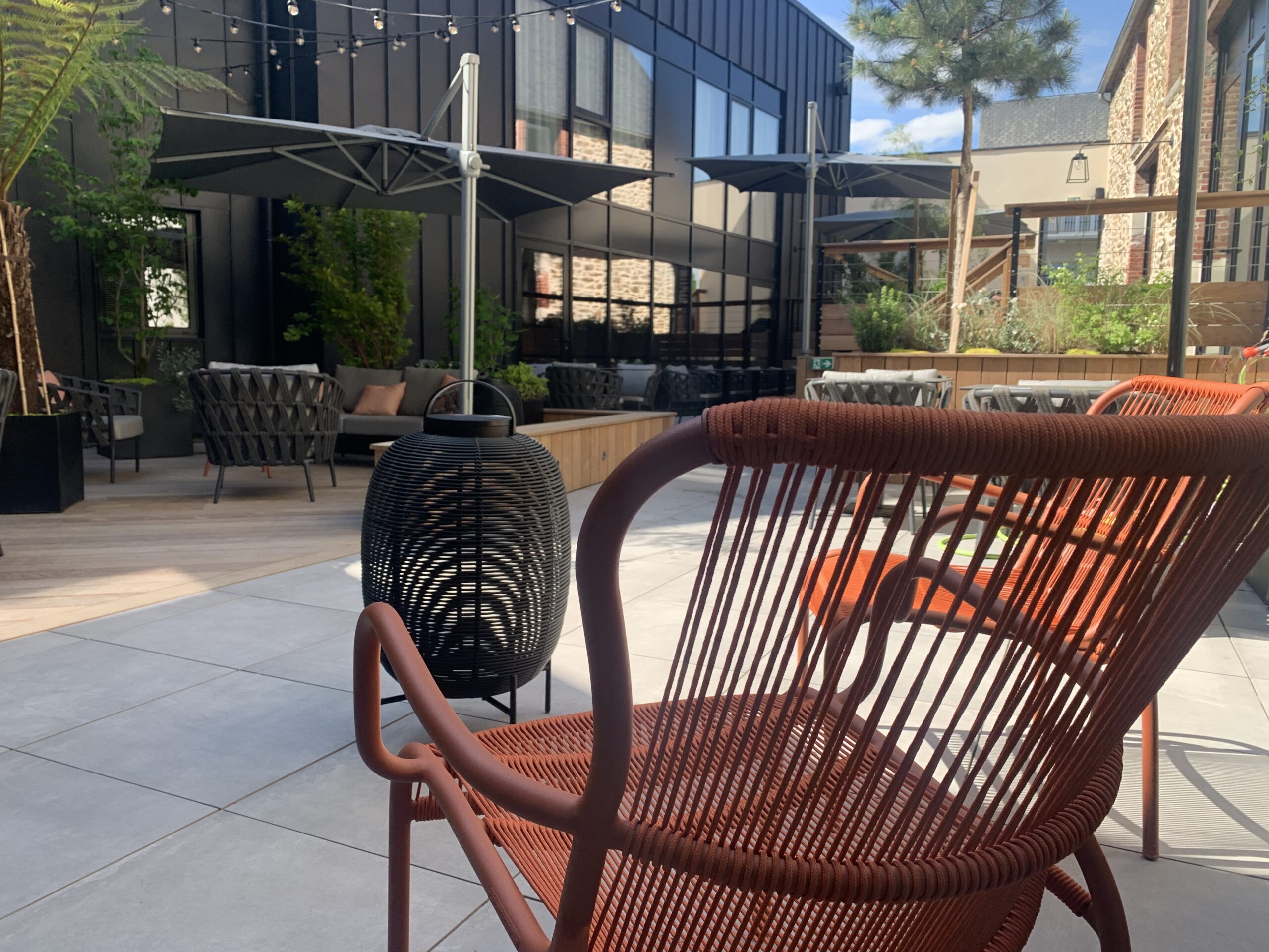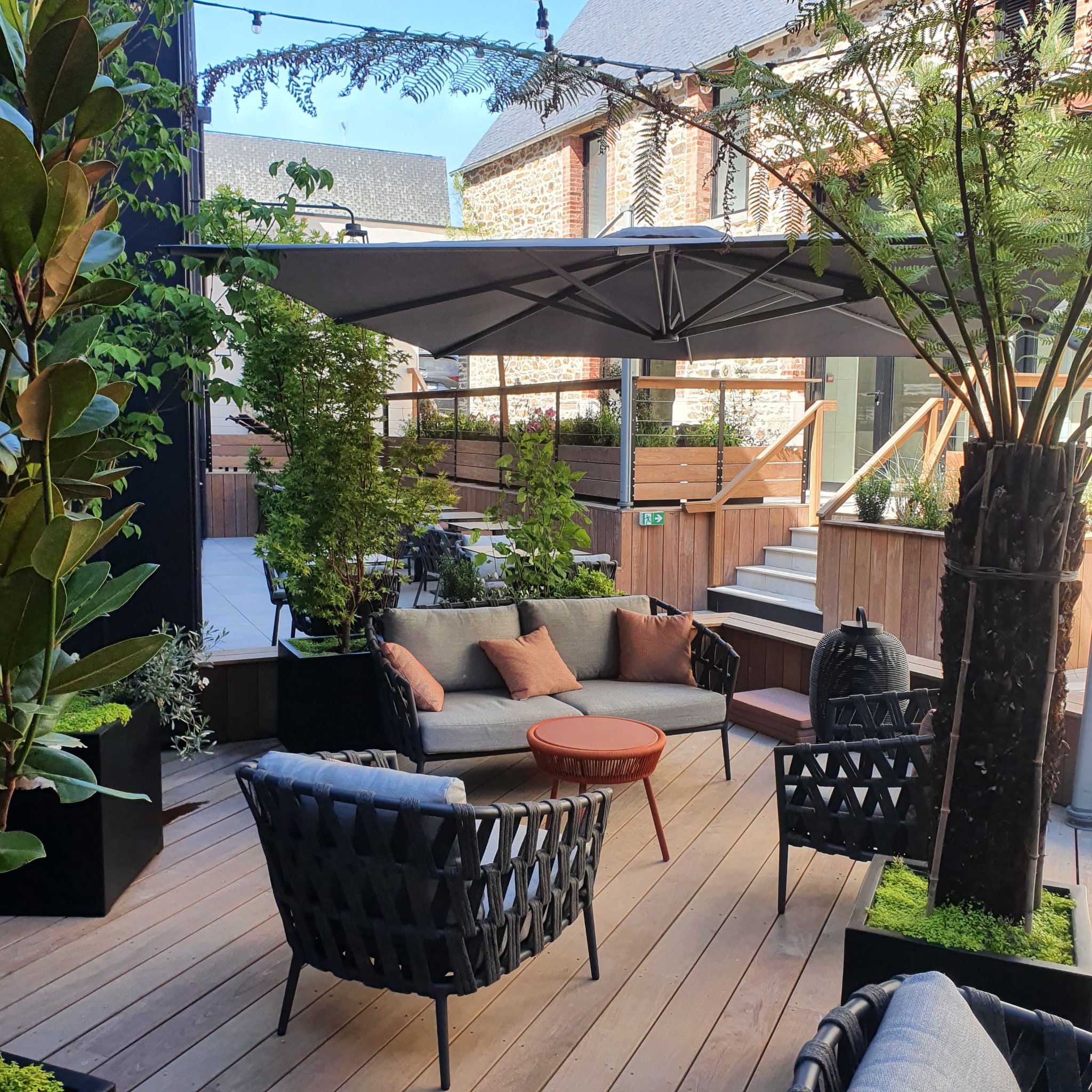 L’entreprise Mahé Paysage a réalisé un espace de terrasse pour des professionnels recevant du public avec terrasse, plantations, mobilier, chaises, parasols géants, etc… une prestation sur-mesure et clé en main pour les professionnels en Côtes d’Armor.